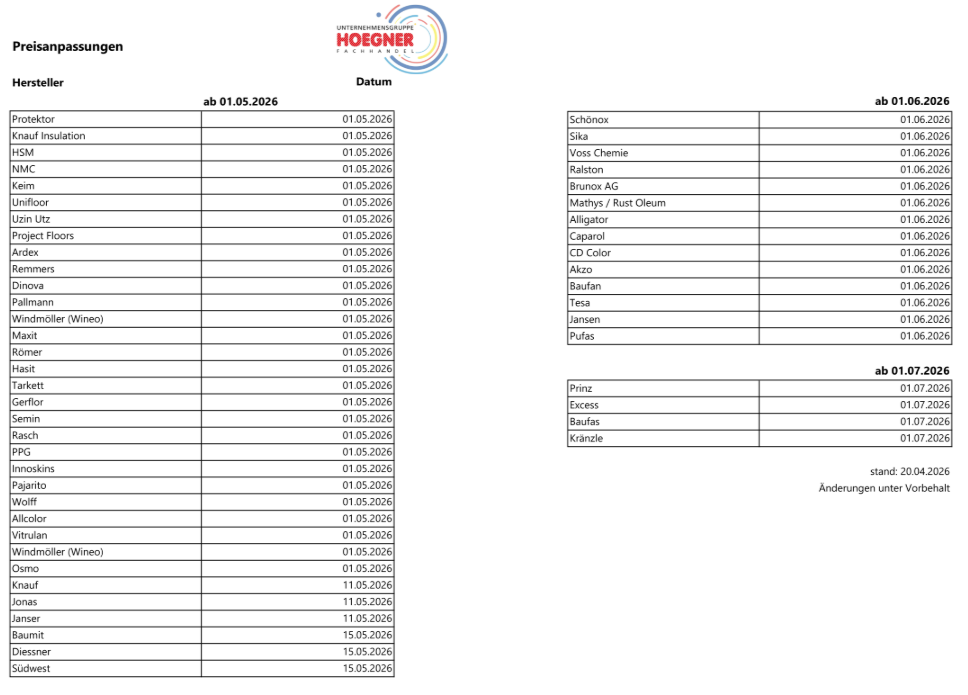 wie in unserem letzten Schreiben bereits angekündigt treten demnächst Preiserhöhungen von nahezu allen Herstellern in kraft.